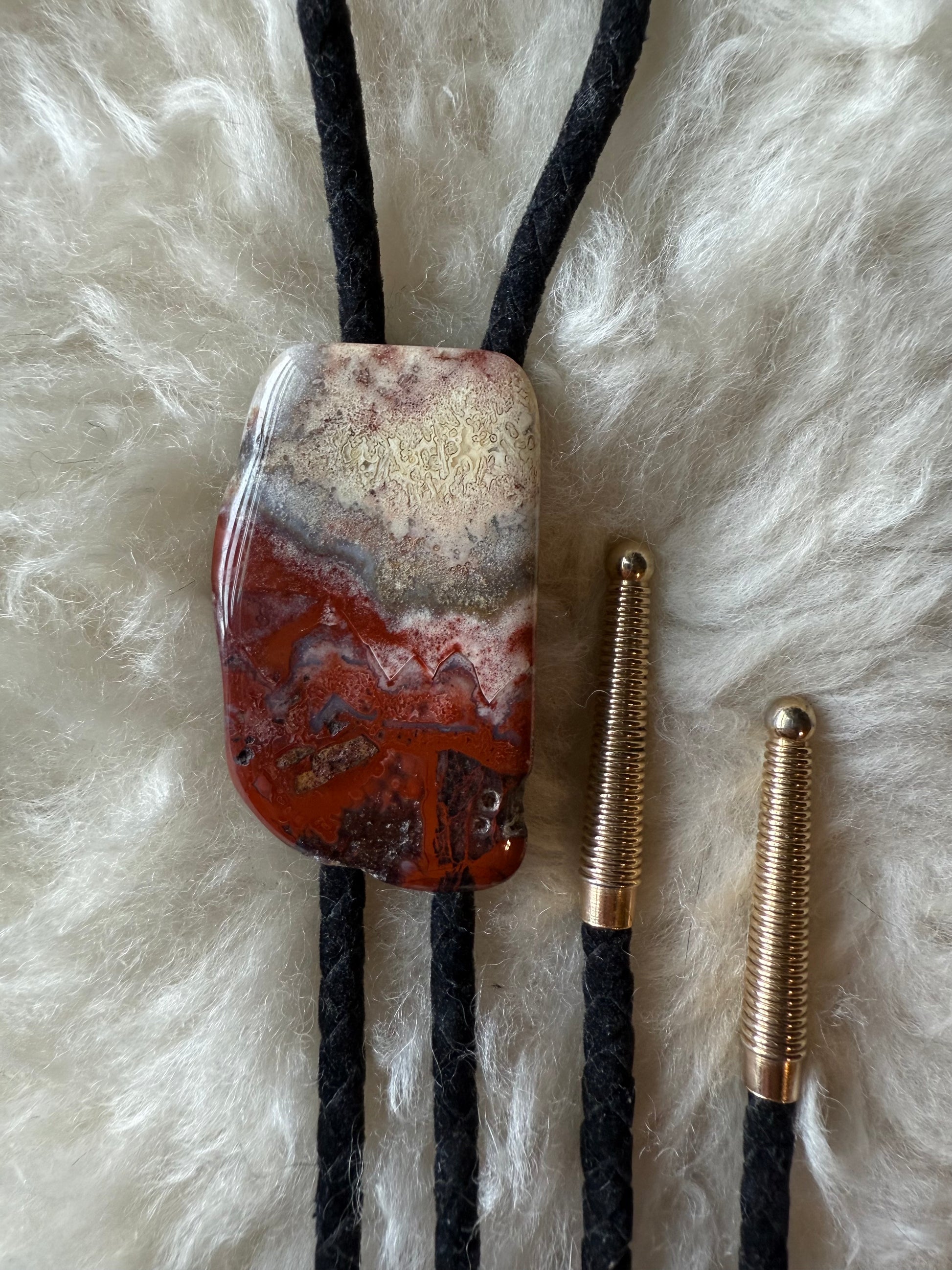 Jasper Agate Slice, black braided suede tie, gold tone aglets